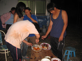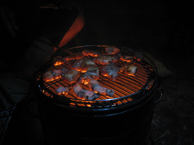 昨晚正在煮菜,接到電話說要來烤雞,速度還真快,電話剛掛沒多久,就聽到車聲,隨後就看到他們全家每個人手上抱著東西過來,烤爐、食物、柴火。。。。一下安靜的平臺熱鬧起來。
