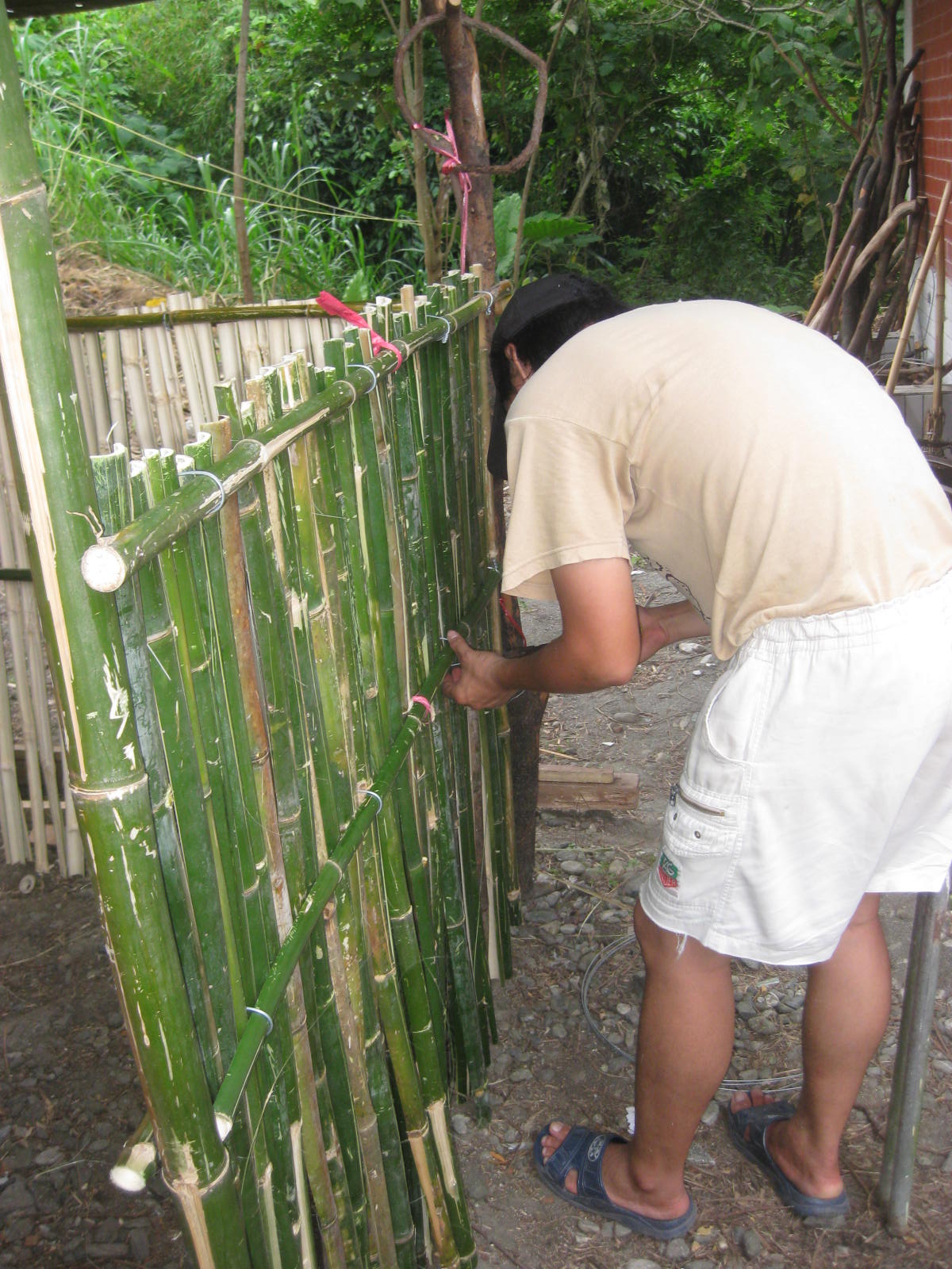 兩個人,從準備材料到現在的狀態用了3天的時間。算了一下除了用的少量鐵線、鐵釘是買的以外,其他材料都沒有花錢。竹子是阿年和許爸爸園子裡砍的,柱子是柴堆裡找來的,衡梁是舊木頭裡回收的,綁竹子的繩子是回收的廣告布撕成布條來用的。超有綠色建築的條件。